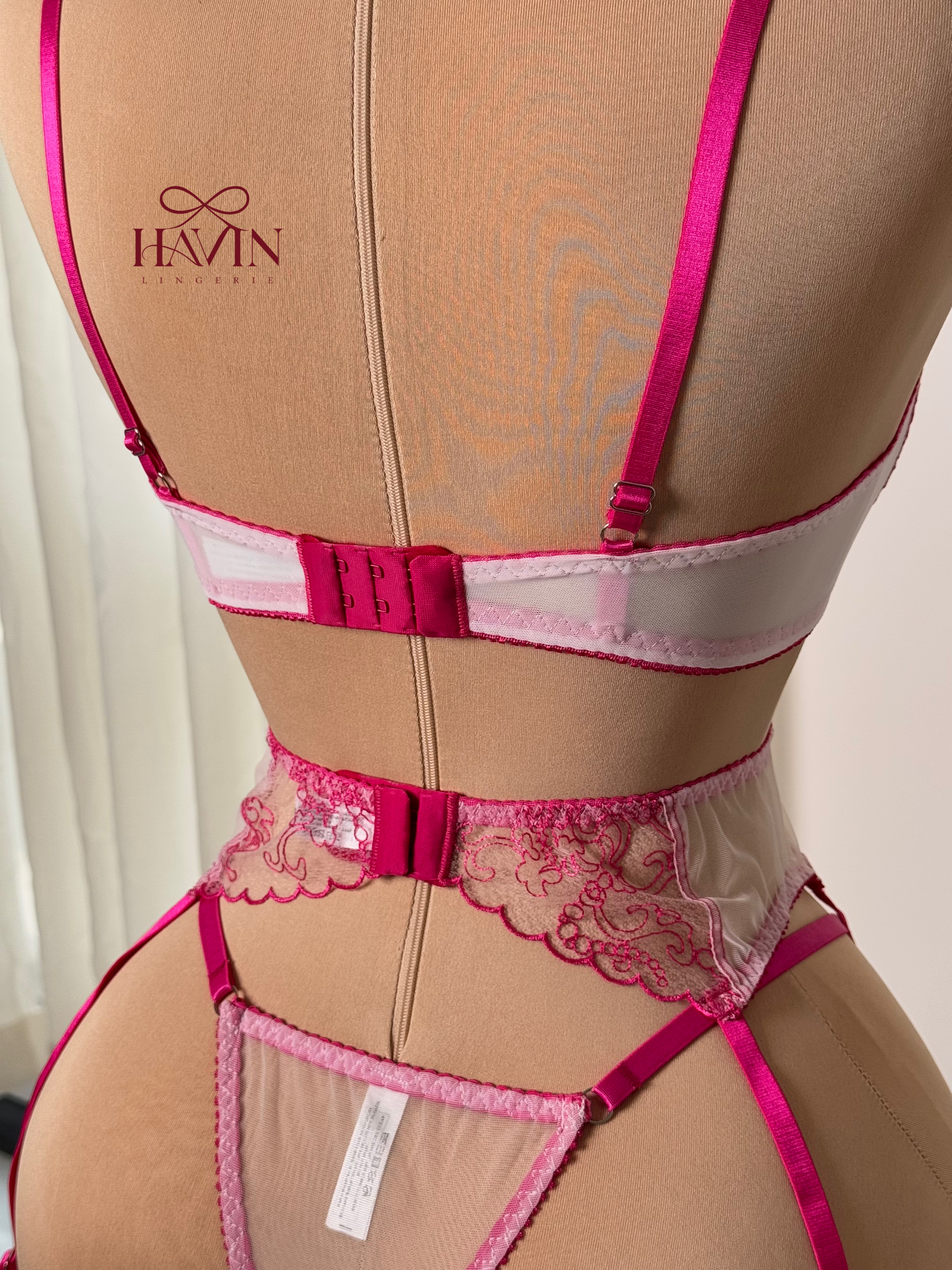 ست سه تیکه گارتردار با تور لطیف و گلدوزی خاص کاپ B قابلیت تنظیم رگلاژ هر سه تیکه قسمت فاق شورت نخی است